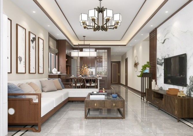 整个客厅采用了大量胡桃木材质,营造自然舒展的格调,整体空间给人感觉现代时尚而又内蕴深藏,营造一个全新的现代中式家居。