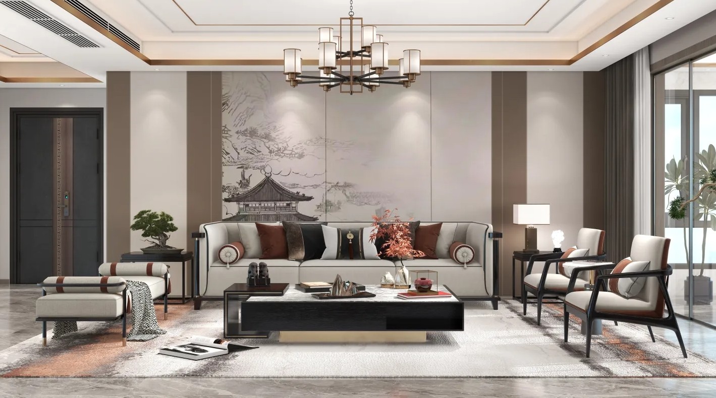 客厅背景采用水墨画作为装饰,搭配不同灯饰、桌椅等中式元素,让古典诗意生活自成一派,既有舒适淡然的气息晕染,也时刻保持着最初的优雅与贵气。电视背景墙的对称式布局中加入细节的转变,在视觉上的展现也变得更为丰富。