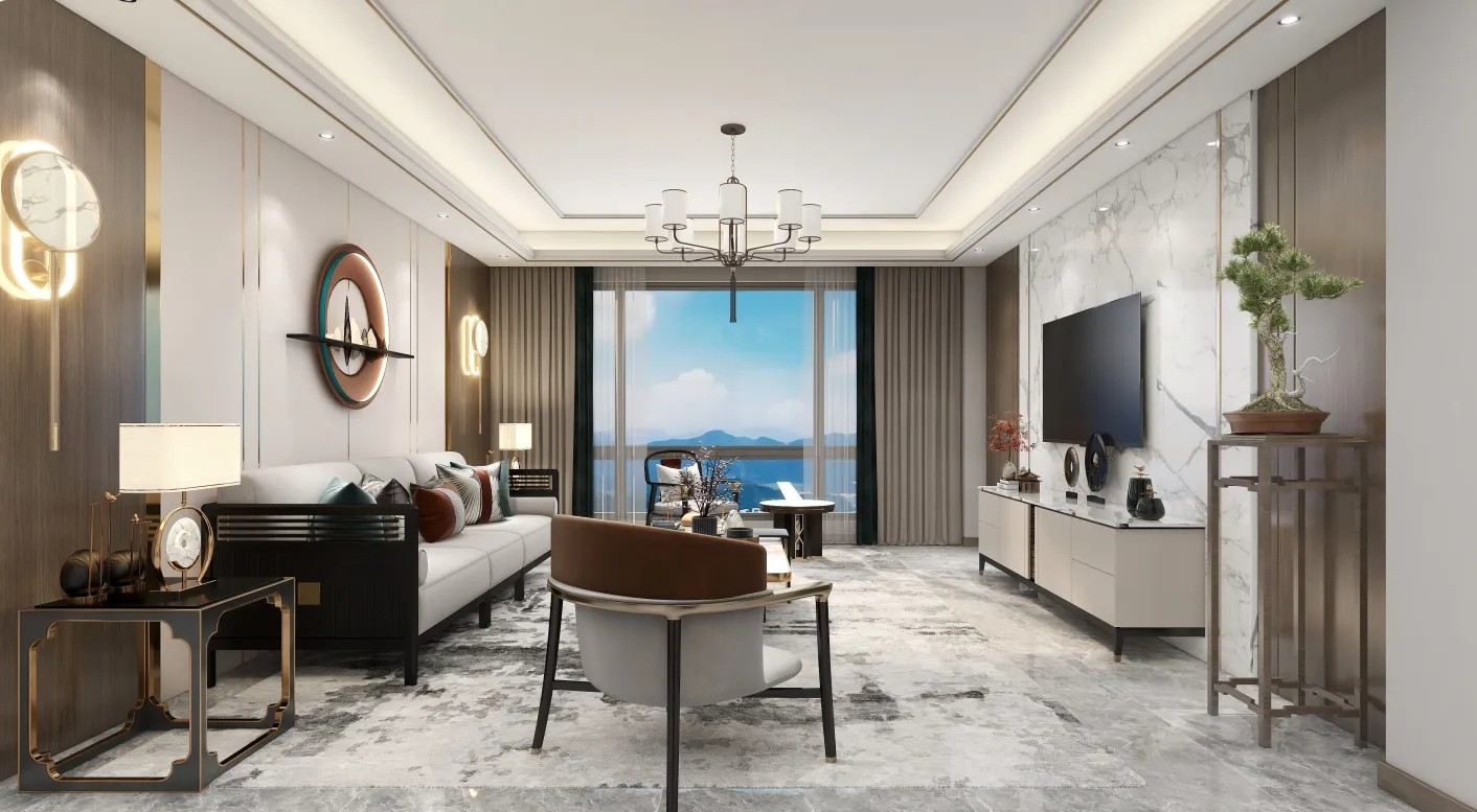 以新中式风格为主基调的居住空间总是自带着简雅与成熟,置身其中感受生活的点滴,端庄华美的软装、清新灵动的植株,以及互相呼应的布局,既是回归自然,也是让心回归最初的宁静、安逸。在工整的对称元素中寻找新中式与现代生活的平衡点,沙发背景墙中布置上立体墙饰,山色悠远、配色稳重,无形中成为生活态度的传递。