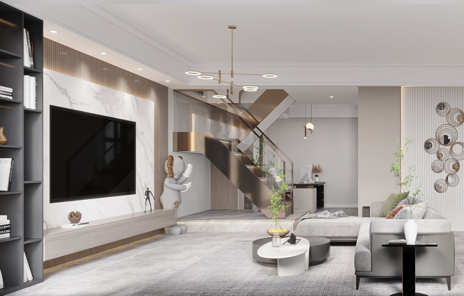 客厅宽敞明亮,大理石电视墙搭配木质元素,质感十足。金属楼梯增添时尚感,沙发造型简约舒适。整体色调柔和,以灰白为主,辅以绿植点缀,营造出温馨且富有格调的氛围,空间布局合理,功能分区明确,尽显舒适宜居之美