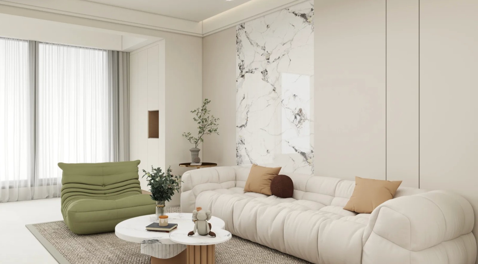 客厅以现代简约风格为主,米白色调搭配大理石背景墙,点缀绿植,营造出温馨舒适氛围