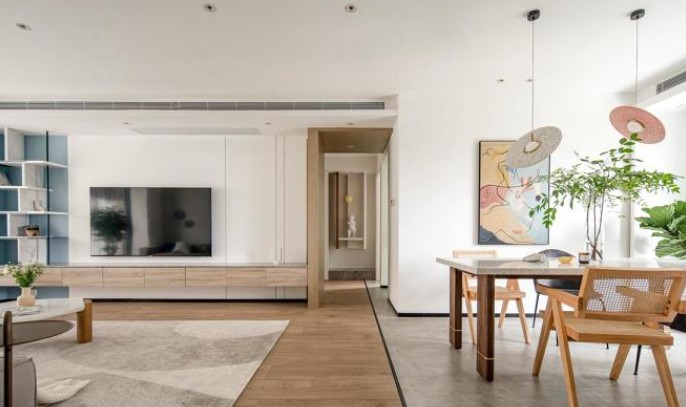 长达4米的悬挑抽屉解决客厅的收纳需求,木色延续至过道门套,拉伸了整个背景墙的视觉效果,个性又不失大气。