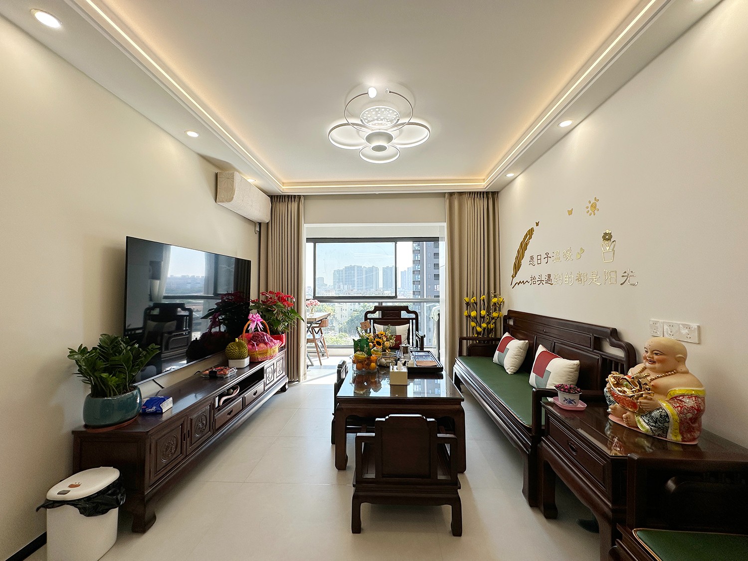 客厅跟阳台打通,地面通铺米灰色柔光砖,双眼皮吊顶内嵌灯带,确保整体的空间延伸。