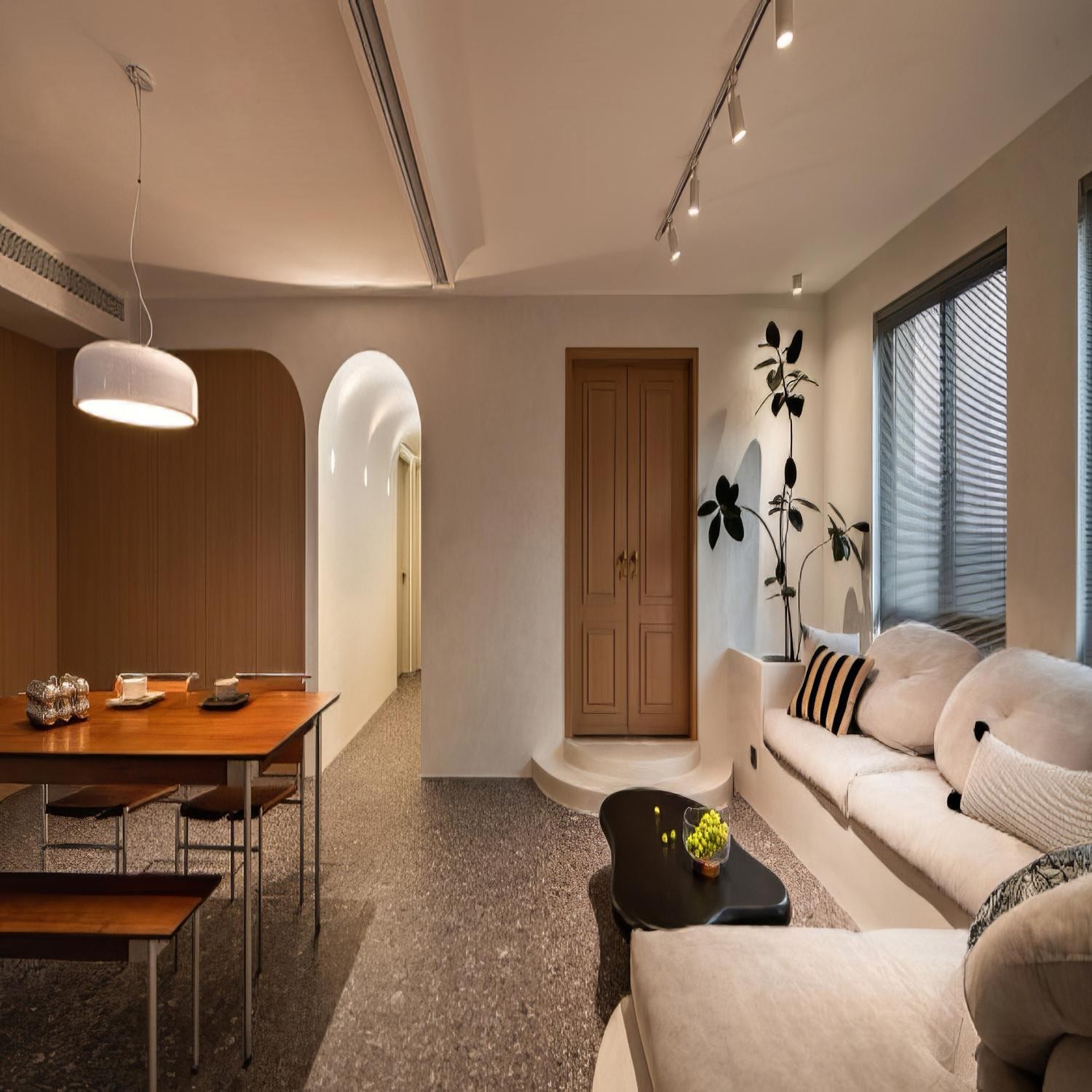 -考虑到柜子过多,很容易产生视觉疲劳感,因此设计师在纯色柜面的基础上增加木格栅的材质交错搭配,利用木格栅的纹理拉伸空间比例,成功开阔了视觉尺度。 -原本主卧右侧是有一段L型飘窗,考虑到右侧会有一个定制梳妆台,所以将背景墙拉平到转角飘窗,在视觉上也会有衍生空间的作用。
