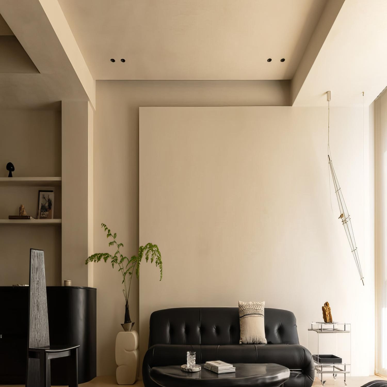 沙发背景墙造型简约,凹槽内嵌入灯带,顺应横梁打造空间层次,同时增添客厅氛围感。米白色系中加入黑色体块,强调视觉重心,丰富复古韵味。