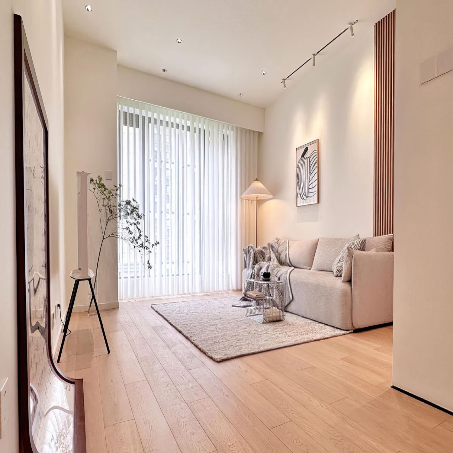 客厅简约大气,墙顶一体的温暖奶油白,若隐若现的梦幻帘,与右侧连通边柜的橡木色不对称饰面板搭配,格调清新,温暖又耐看 来自丹麦品牌沙发扶手轻盈,坐感舒适宽大,款式经典耐看,非常适合中小户型选择,墙面的人物插画作品,搭配休闲毯与抱枕,为原本略显寡淡的视觉面带来一丝微妙的变化与夏季的清凉感,一支进口的绿植吊钟,简简单单就已经足够画龙点睛