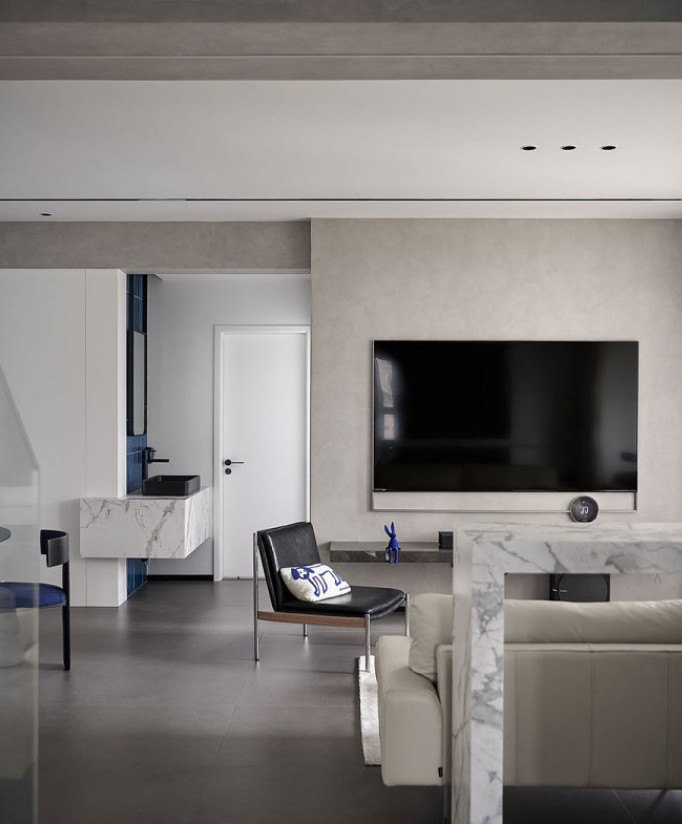 黑白灰搭配的主色调,一抹冷峻的克莱因蓝对撞色彩从大面积留白的空间里跳脱出来,体块的交错重叠和结构相互穿插,空间呈现出时尚、简洁、干练的视觉感。