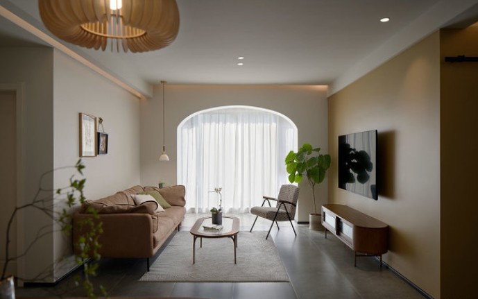 打通的阳台与客厅合为一体,原本两侧是方形的建筑门洞改成了拱形,通过圆润的形体吸引人的目光,成为空间的视觉聚集点。无论是大落地玻璃外呈现的如画般窗景,还是拉上白纱时被微风吹拂的轻柔。