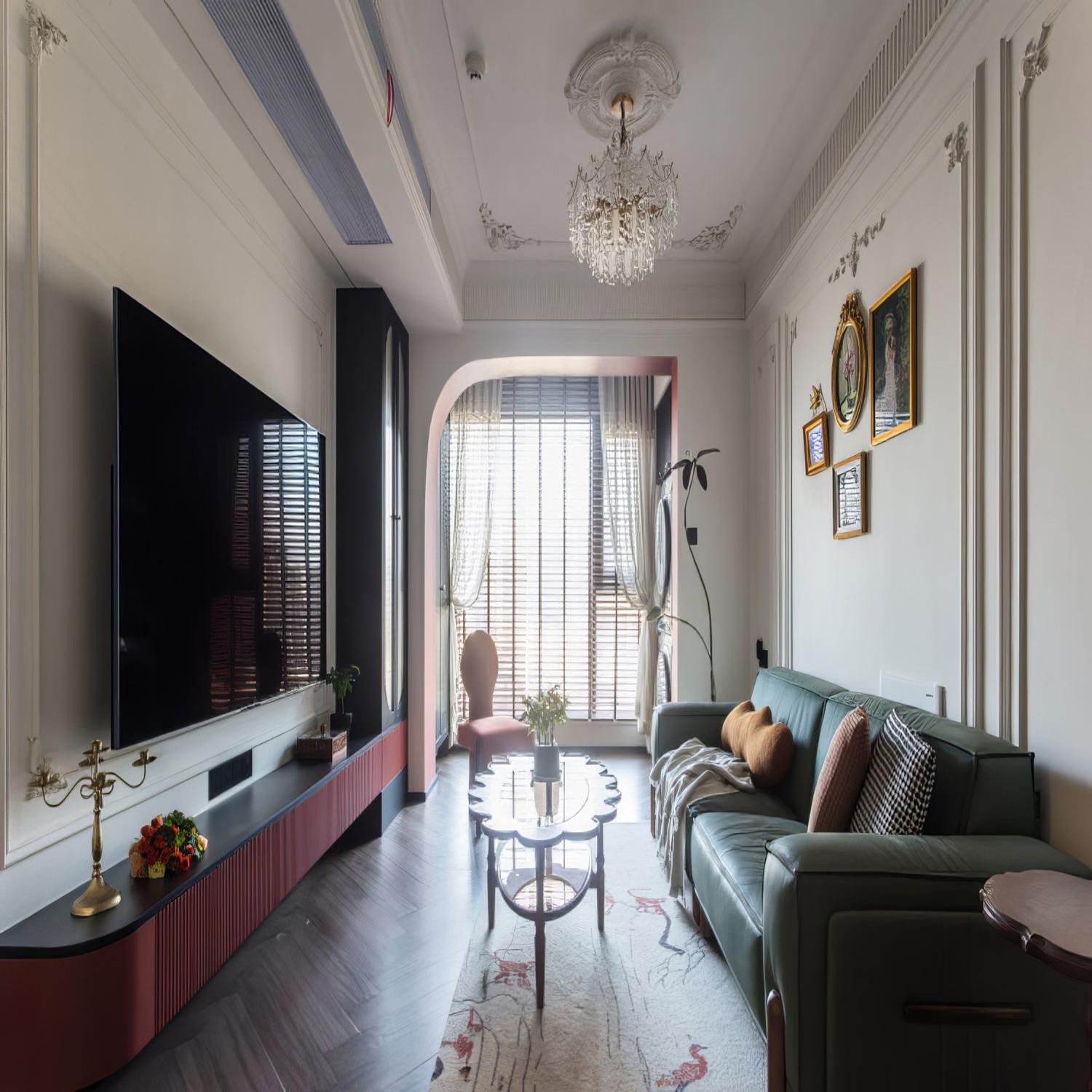 沙发背景墙用pu线条根据比例设计,小角花搭配1.5公分的线条、金色的画框搭配复古的油画、玻璃和水晶材质的灯具都给家增加了一些精致度。