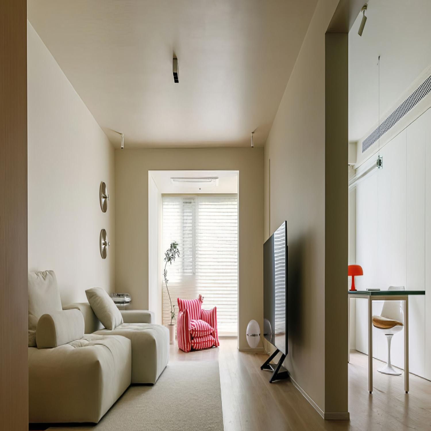 电视我们选择了直接落地的款式,高度也可以随意调节。我们也没有按照传统的形式在沙发前摆放茶几,这样在空间里就可以体验到更加自由的状态。