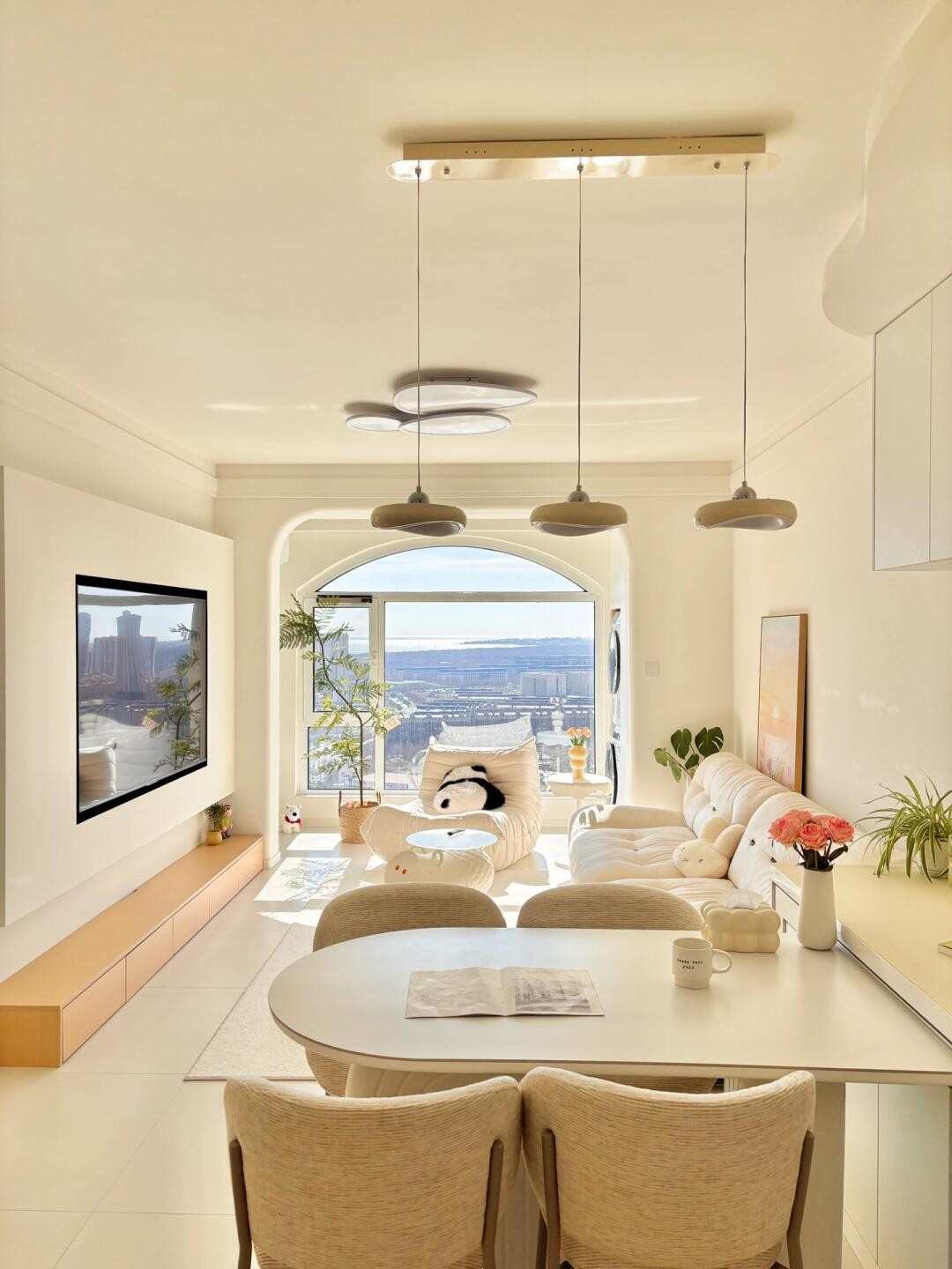 客厅没有复杂的装饰,温柔的乳胶漆墙面在自然光下,每一处都透着温暖和惬意~