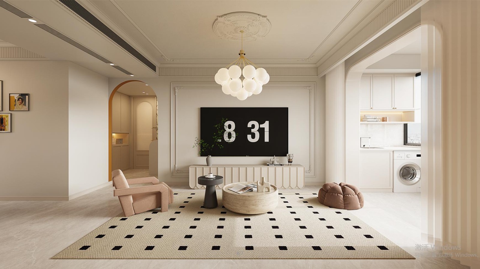 整体风格是奶油风 地面通铺瓷砖 石膏线条修饰