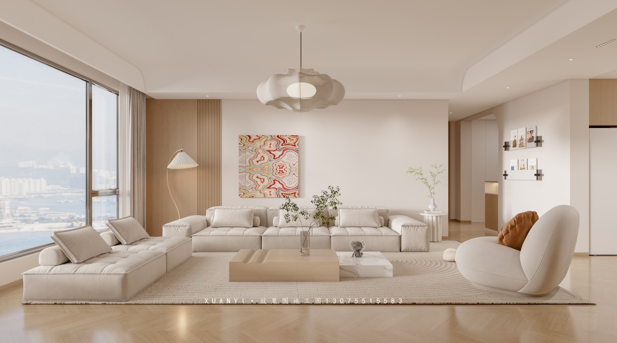 珍珠白➕可可糖的乳胶漆,窗帘是很温柔的奶茶色,高温定型后很有质感,纱帘是透光不透人的幻影纱,满满的氛围感~