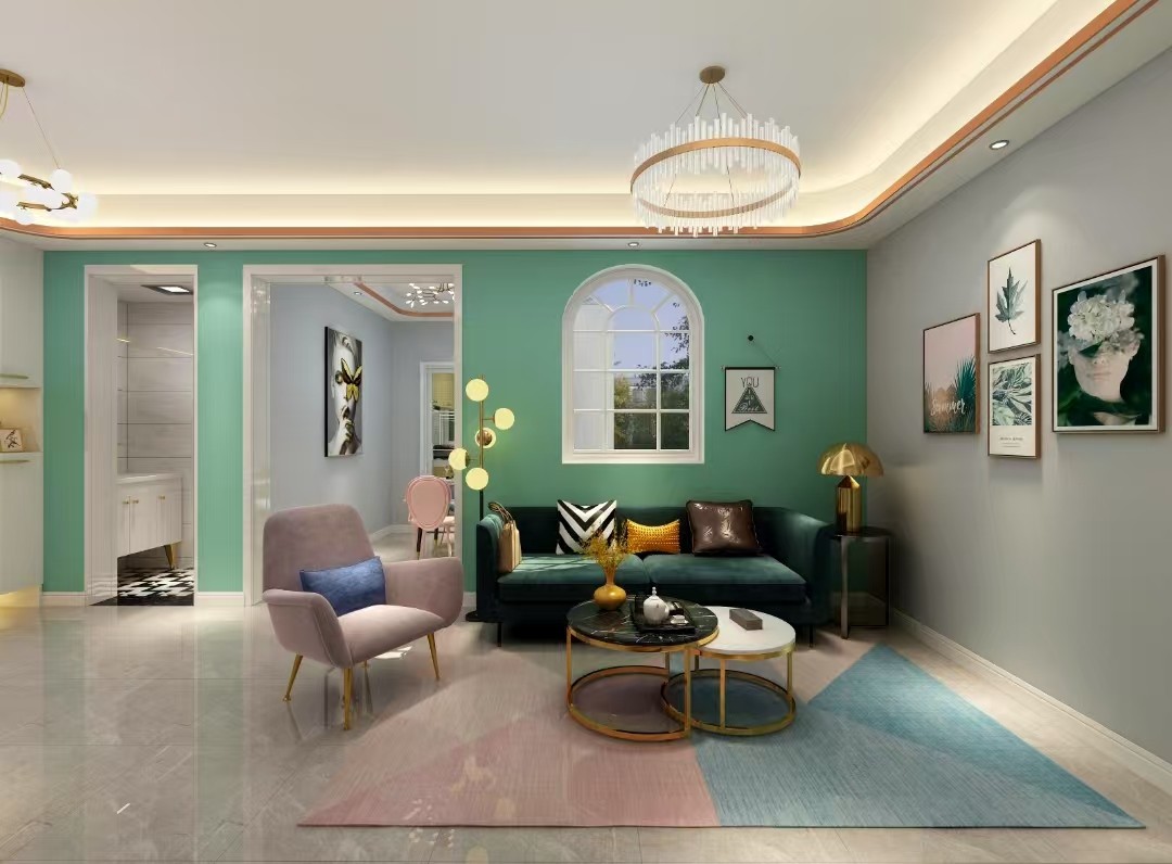 客厅采用简洁的布局形式,颜色上采用蓝绿和灰色进行搭配设计。