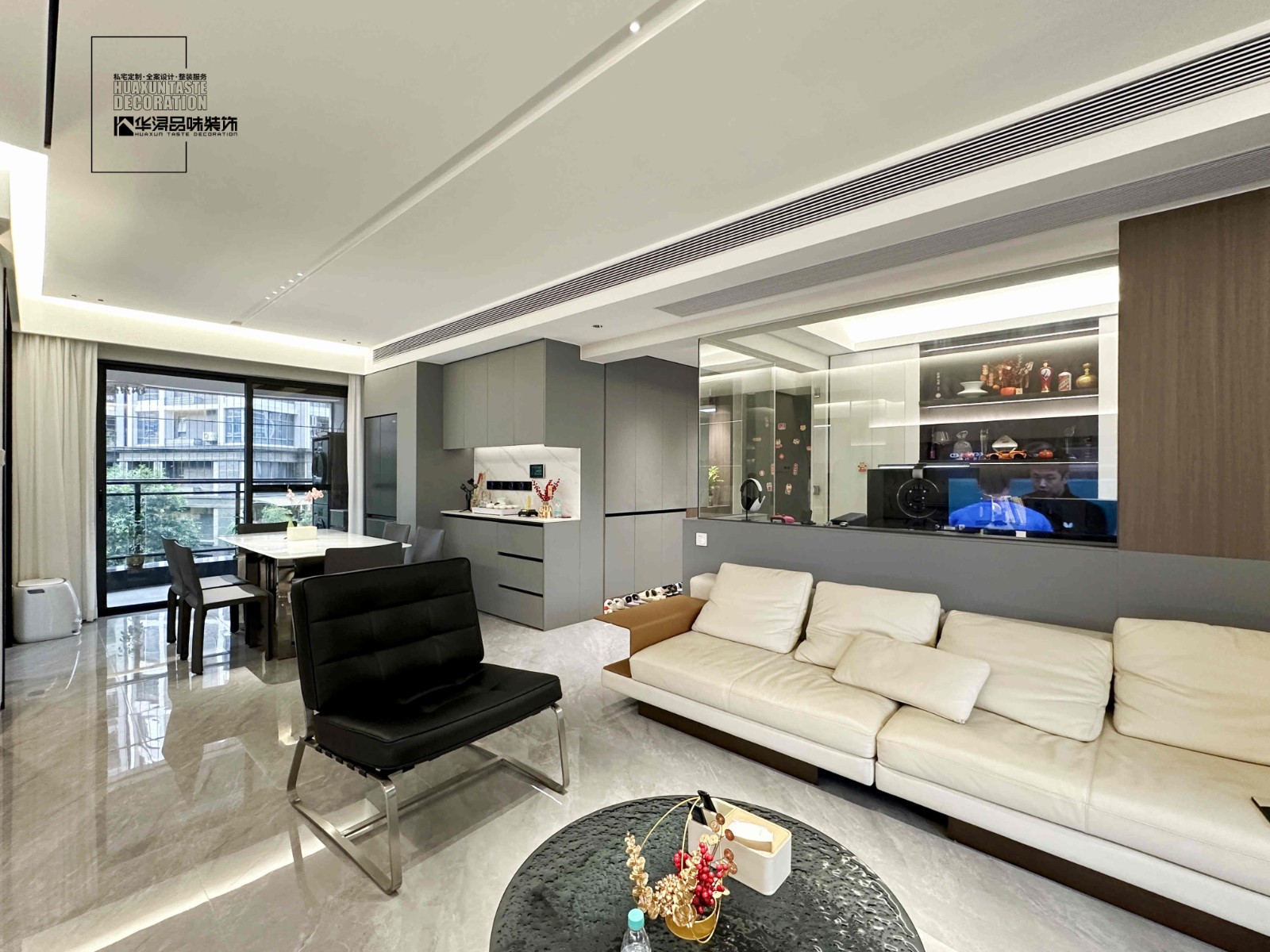 全屋天花无主灯设计,主打不兜灰,空间显大,地面通铺75*1500浅灰色大砖,搭配现代家居家私,效果非常不错!