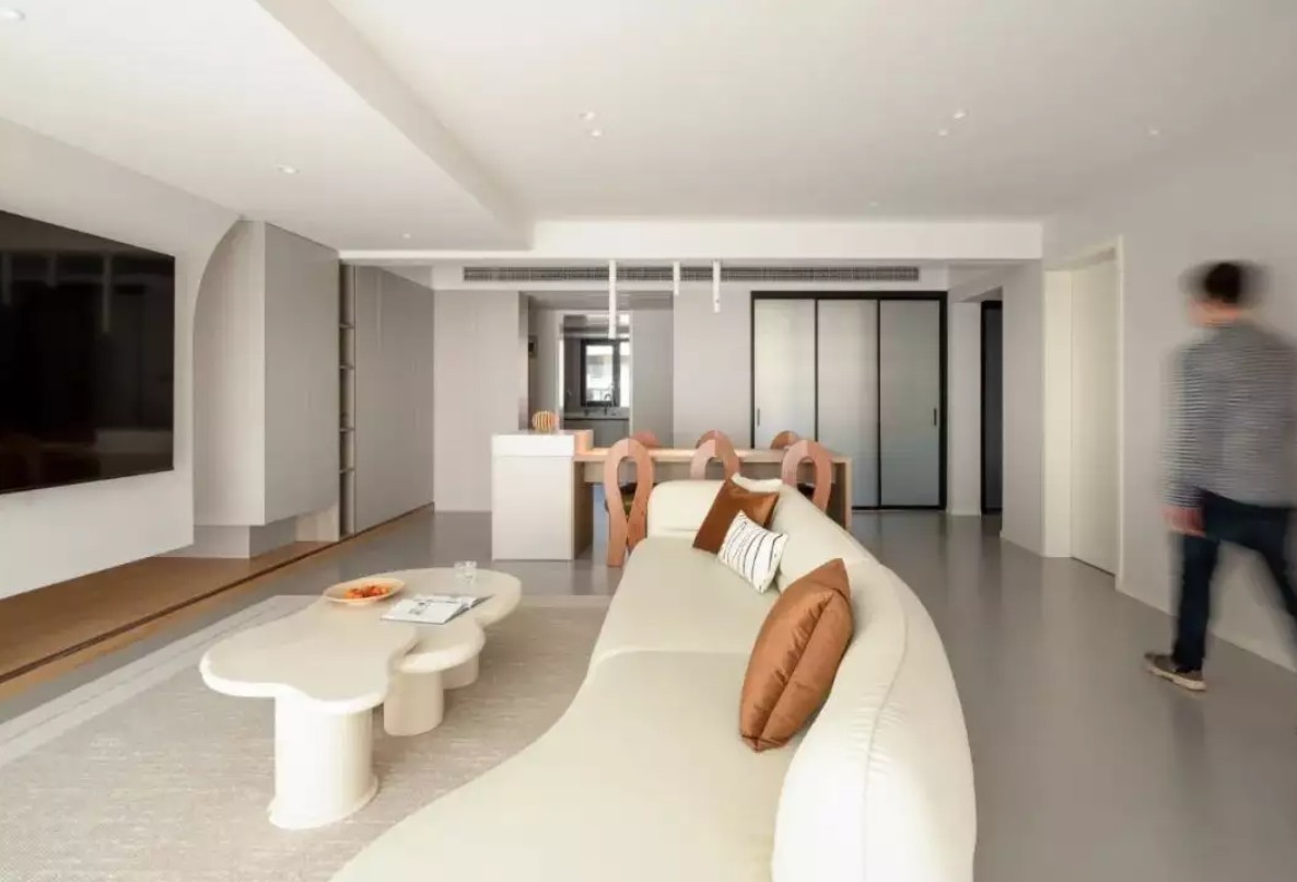 客厅以现代大方的空间,以奶油风配色搭配,天花板采取吊平顶+嵌入筒灯的设计,让客厅空间显得简洁而又大气。地面是灰色亚光砖,与极简的空间更加呼应。布置上米白色的沙发、茶几,让空间充满奶油风的气息,简洁优雅而大气