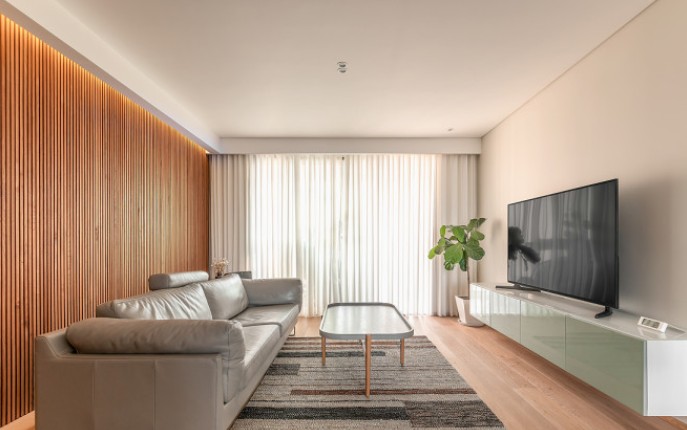 客厅背景墙整体的柚木实木条,搭配白色垂直帘,让整个家清新自然,安逸。
