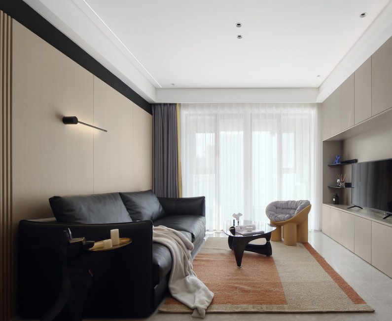 客厅无主灯的设计,让空间更加干净简洁,黑灰皮质沙发在木色背景衬托下显得更加***和个性。
