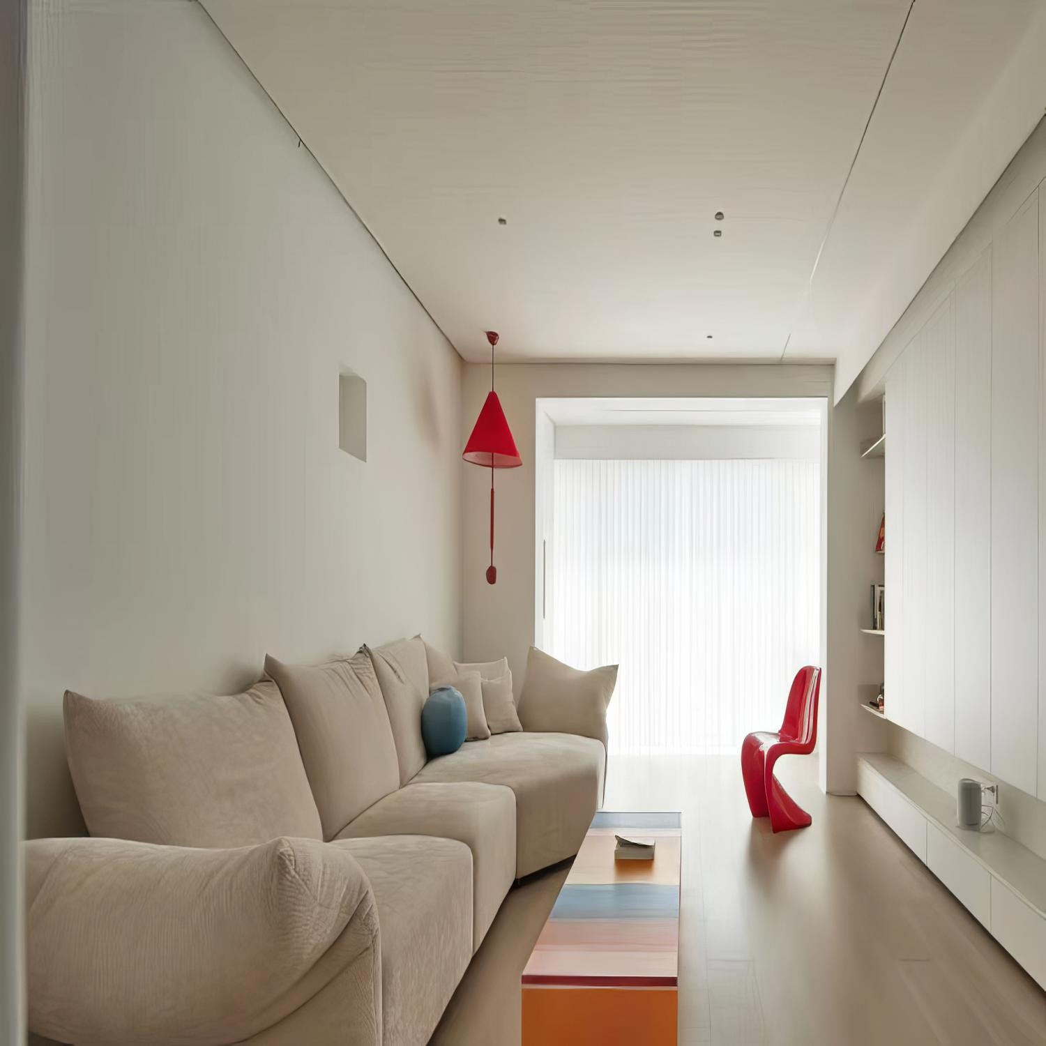 Maison Dada的红色大伞灯带来美妙的悬浮感,在柔软的白色沙发上方显得分外抢眼,跳脱常规的束缚,热烈的鲜红色让客厅焕发出独特的魅力。