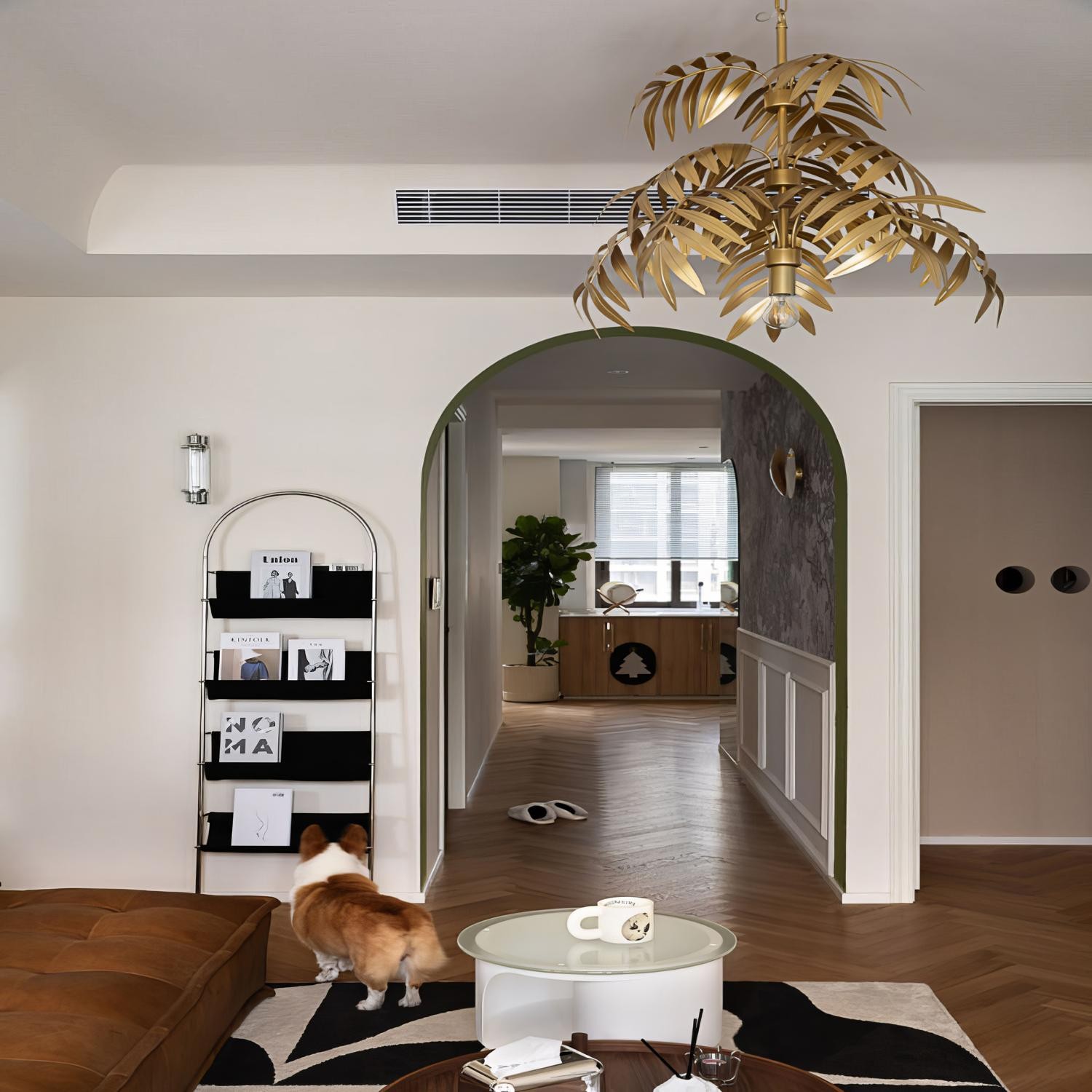 金属叶片吊灯给客厅提一抹亮色。