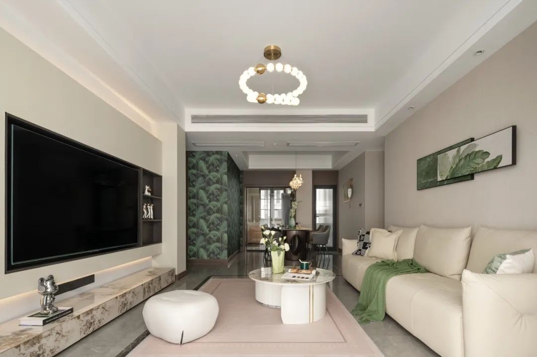 将客厅阳台打通,拥有更好的视野。客厅原有窄边加宽提升全屋大气感,阳台窗帘轨道嵌入吊顶的处理更加美观。