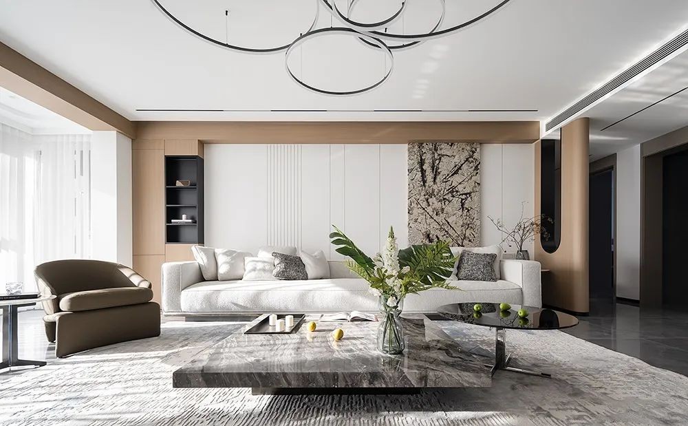 主卧位于空间尽头,相对私密也更不受公区打扰;有独立的衣帽间,卧室功能也可以更加简洁;床头柜+开放格+定制柜一体化设计,不仅避免卫生死角,便于日常清洁;还提升空间利用,避免打不开柜门的问题