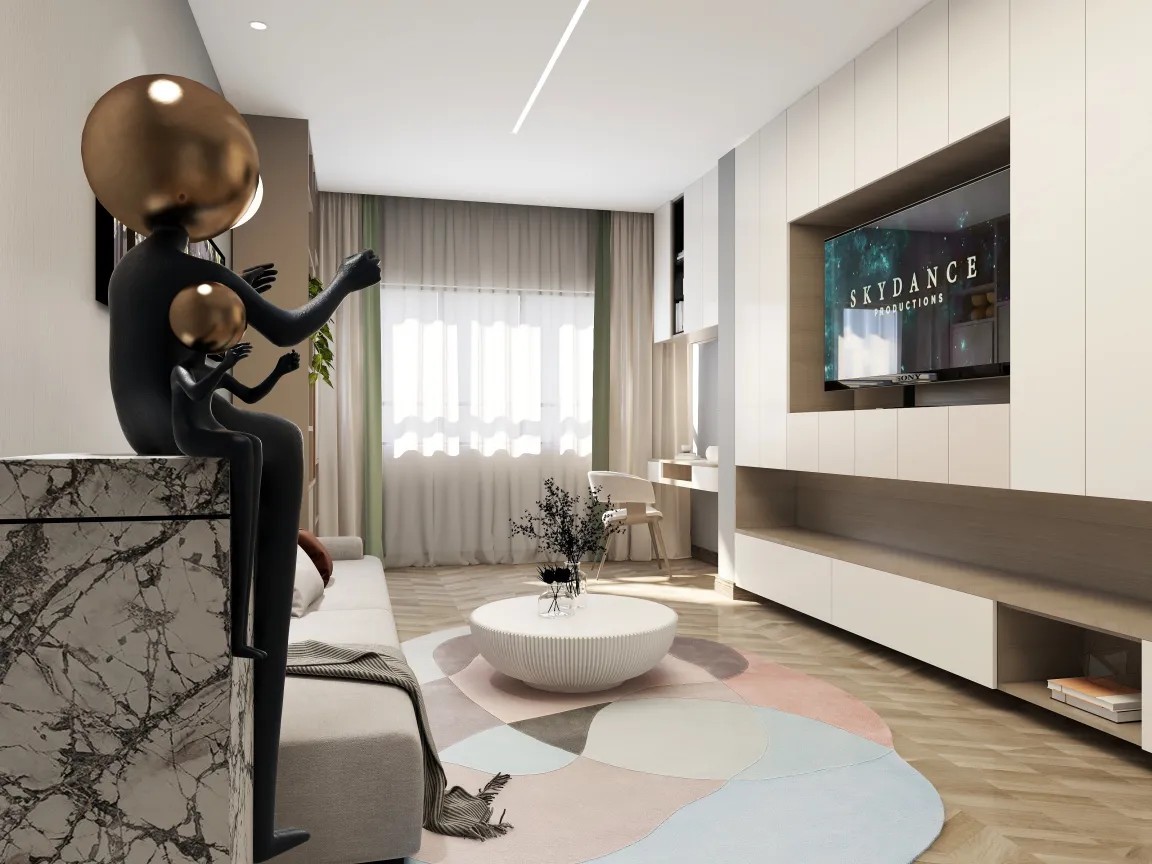 做了大平顶和无主灯设计,电视柜和阳台的书桌搭配在了一起