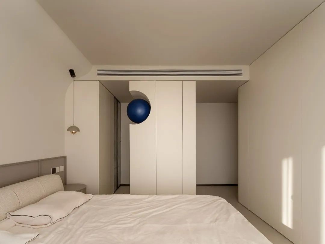 奶白色的柜子与墙体保持同色,让主卧空间更加宽敞明亮。走廊尽头的衣柜搭配雕花玻璃,当衣柜的灯光缓缓亮起就成了主卧室套房空间的入门端景。一组小衣柜搭配蓝色的建筑球体,巧妙地将卫生间门做了遮挡。光线通过建筑球体与间隙进入过廊,卧室过廊和卫生间的动线设计成环形动线,屋主可以自由选择去卫生间及换衣的路线。