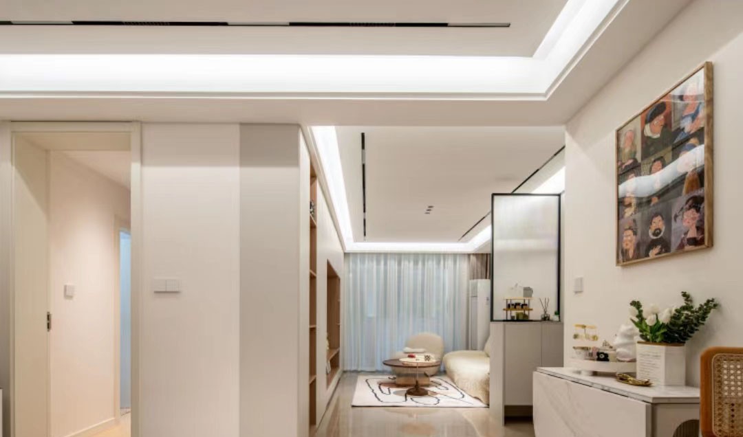 顶部采用无主灯设计,吊顶四周采用嵌入式隐藏灯,补充室内光源还提升了***感。