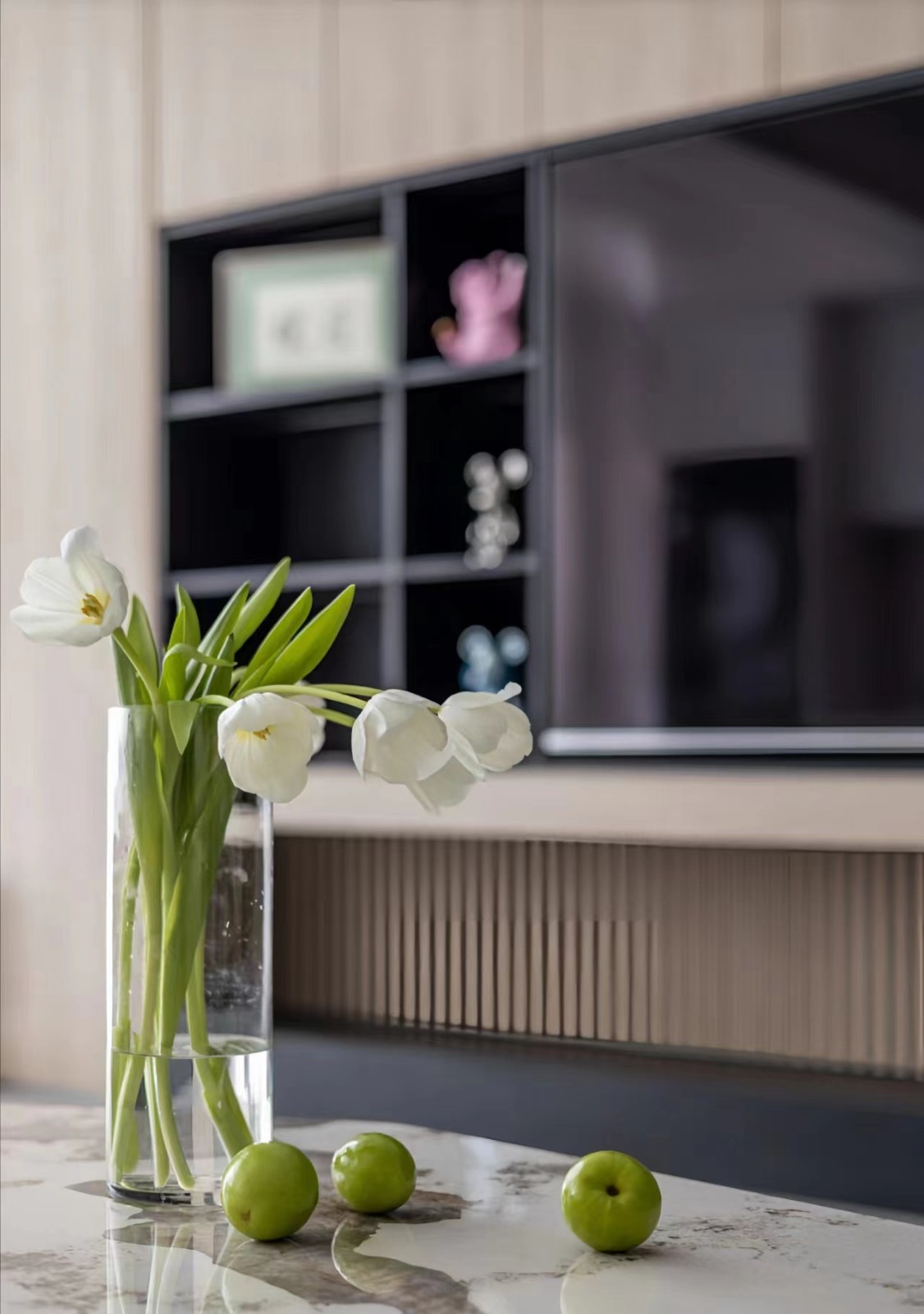 选择整体以白色调为主,搭配原木的组合,整个风格干净清爽。深浅不一的白色,突显丰富的层次感,大面积留白也是贯彻极简的设计手法,简约又有格调。阳台和客厅打通之后,选择落地窗,室内通风光线更加充足。岩板茶几造型别致,精致的纹理和质感,颇有低调奢华意味,搭配绿植花艺的点缀,更增添了一丝自然活力。沙发后方的次卧门与墙面融为一体,并不显得突兀,其次门边设置收纳柜,可以收纳一些日常物品。