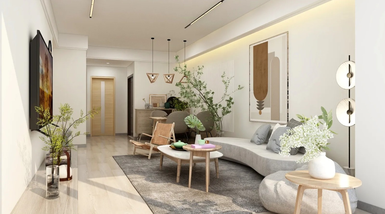 空间以中性色调为主,搭配木质家具和柔和的照明,营造出温馨舒适的氛围。墙上的抽象画和绿植装饰增添了艺术感和自然气息,整体布局开放通透,细节处理精致。