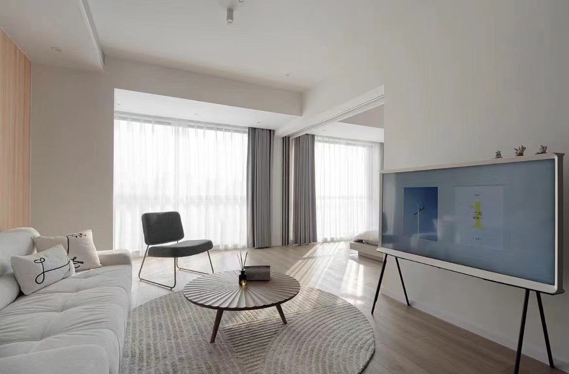 客厅以白色和原木色为基调,配上灰色主沙发,营造出一种简洁、干净、纯粹的本真空间,演绎不一样的故事和情感。