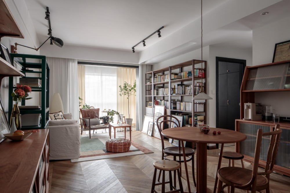 户型基本满足生活需求,局部小改,未设定主题和规则,一切从屋主的内心所求出发。通过墙面的少量复古撞色、不同的天然木材、大理石、异国风情图纹瓷砖、古典玻璃、棉麻、书本、挂画等元素在空间中进行创造。用串联的形式将折衷主义风格的空间紧密连接起来,并尽量减少智能产品,只聚焦平淡而温馨的生活,缓解社会与网络带给大脑的信息压力,营造属于自己的生活美学。