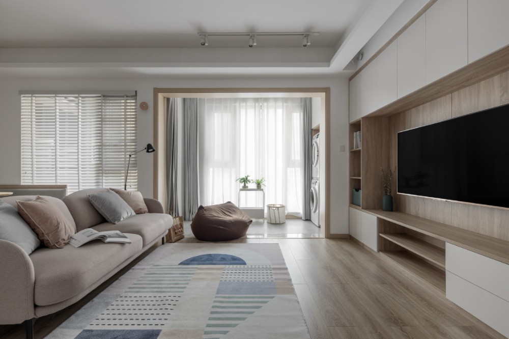 客厅空间以原木色搭配纯净白,天然材质与留白在融会贯通之间体现出轻松自然的舒适氛围。电视墙以储物组合柜进行展示,40cm深度的柜体满足了屋主喜爱收纳的需求。