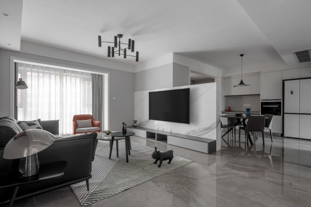 浅灰色与爵士白整体呈现出简洁明快的空间感。而原本一览无遗的公共空间被半墙造型电视墙巧妙的分隔,“遮蔽与敞开”的悄然切入,制造透视错觉,将原本无聊的空间划分为有趣的形态呈现出来