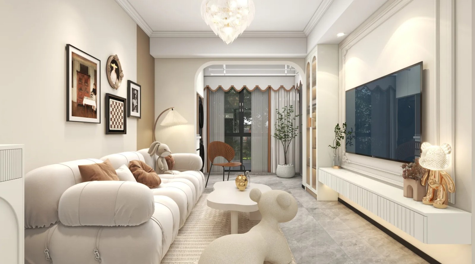 整体以米白色为主色调,搭配柔和的灯光,营造出温暖的氛围。L型沙发与圆形茶几相得益彰,墙面装饰画增添了艺术气息。拱形门框连接阳台,增加了空间的通透感。电视墙简洁大方,旁边的装饰摆件为客厅增添了个性和趣味。