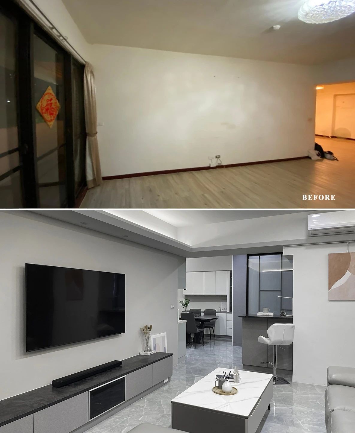 由于客厅面积宽裕,为与后方橱柜共构一致性壁面覆以浅灰漆料,并延续布纹灰质材打造下方电器柜,左侧穿引灰玻门片与仿大理石纹长柜正是设计团队于各区梳理收纳机能,使储物容量完美整合手法
