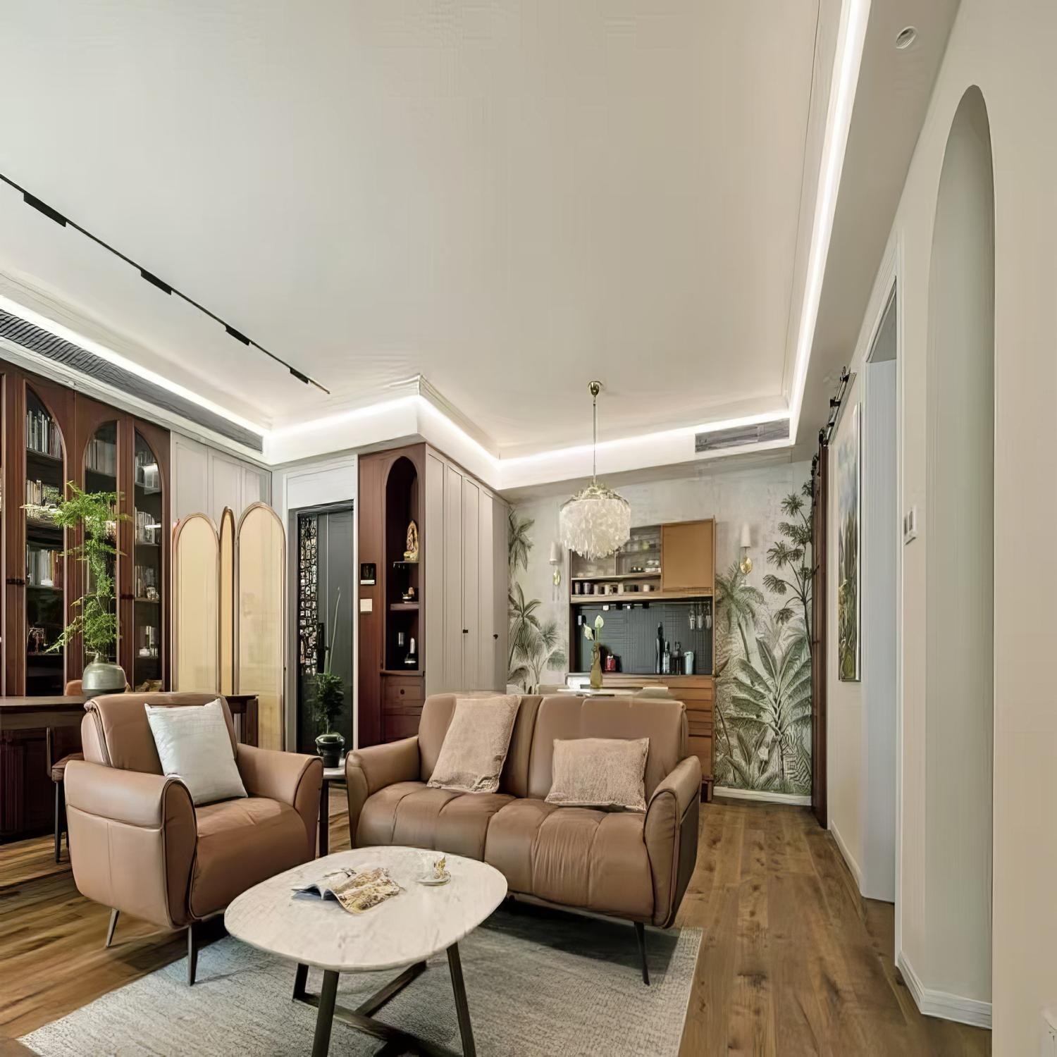 绕过屏风,空间豁然开朗,功能布局被精心雕琢。客餐厅区域占据了总面积的三分之二,毫无争议地成为核心地带。客厅中,一组柔软的布艺沙发围合摆放,搭配温润的木质茶几,营造出温馨的交流氛围。沙发对面,悬浮式电视柜简洁时尚,上面摆放着精致的摆件与尺寸适配的电视,满足日常休闲娱乐需求。天花板上无主灯设计,通过筒灯、射灯与磁吸轨道灯的巧妙组合,让光线层次丰富。地面通铺的浅灰色柔光地砖,不仅耐磨易清洁,还在视觉上拓
