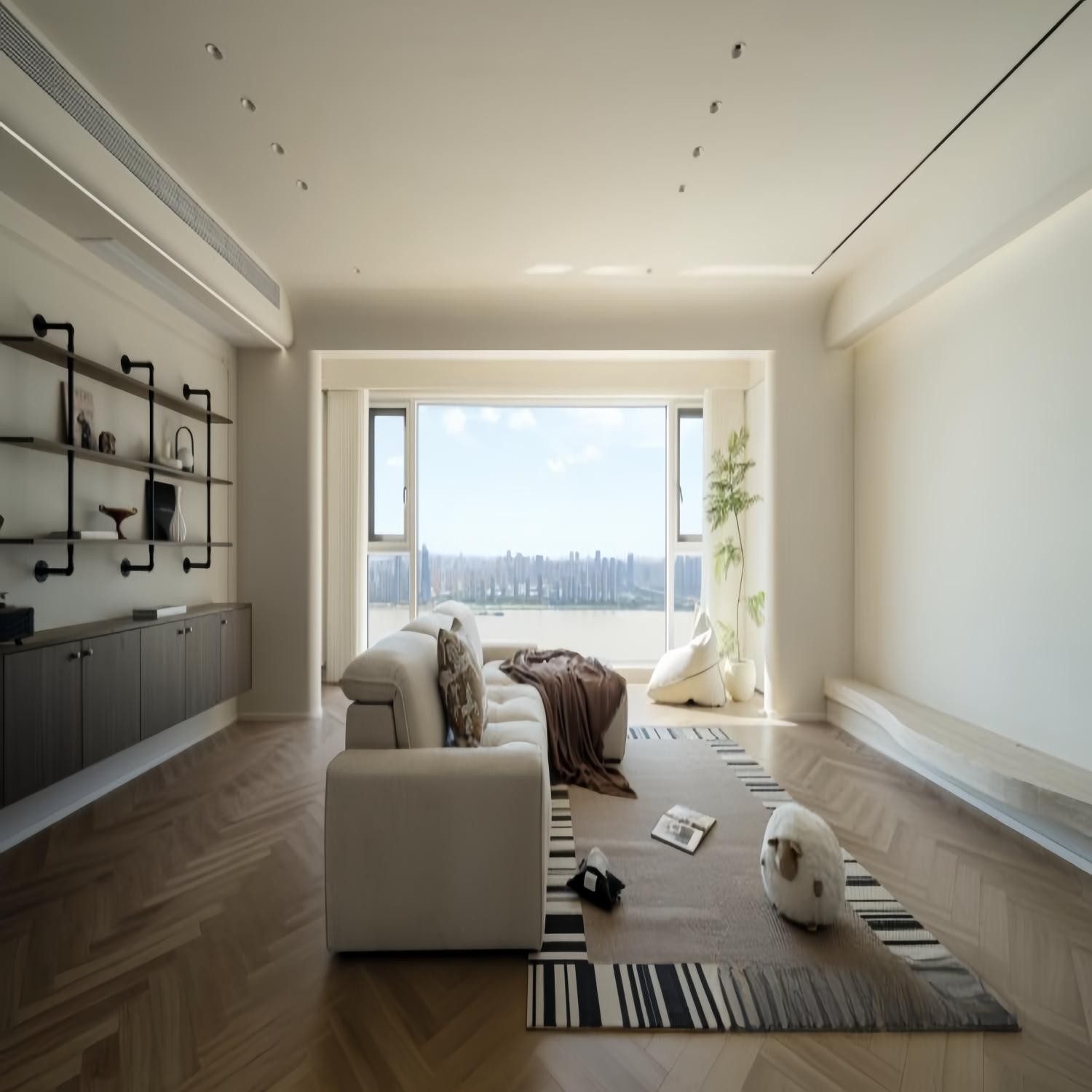 客厅与阳台之间选择人字拼木地板通铺而过,从视觉上强调空间的整体性,以拉近内外尺度,让家更开阔明朗。阳台侧面靠墙定制通高收纳柜,纯白极简无把手柜面,让收纳隐于墙体,既美观又丰富了实用性。 #客厅 #沙发 #落地窗 #阳台