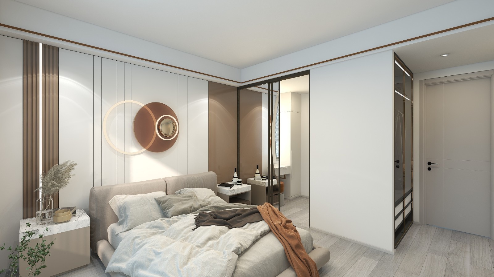 主卧暖色调的床头软包和整体风格相呼应以深棕色点亮视线,大气沉稳之中透露出些许温柔治愈。小型衣柜间满足日常储物需求。在宁静的卧室空间中,沉淀出使人内心安定的空间力量。于此,安然入眠,拥有一晚属于都市理性的浪漫。