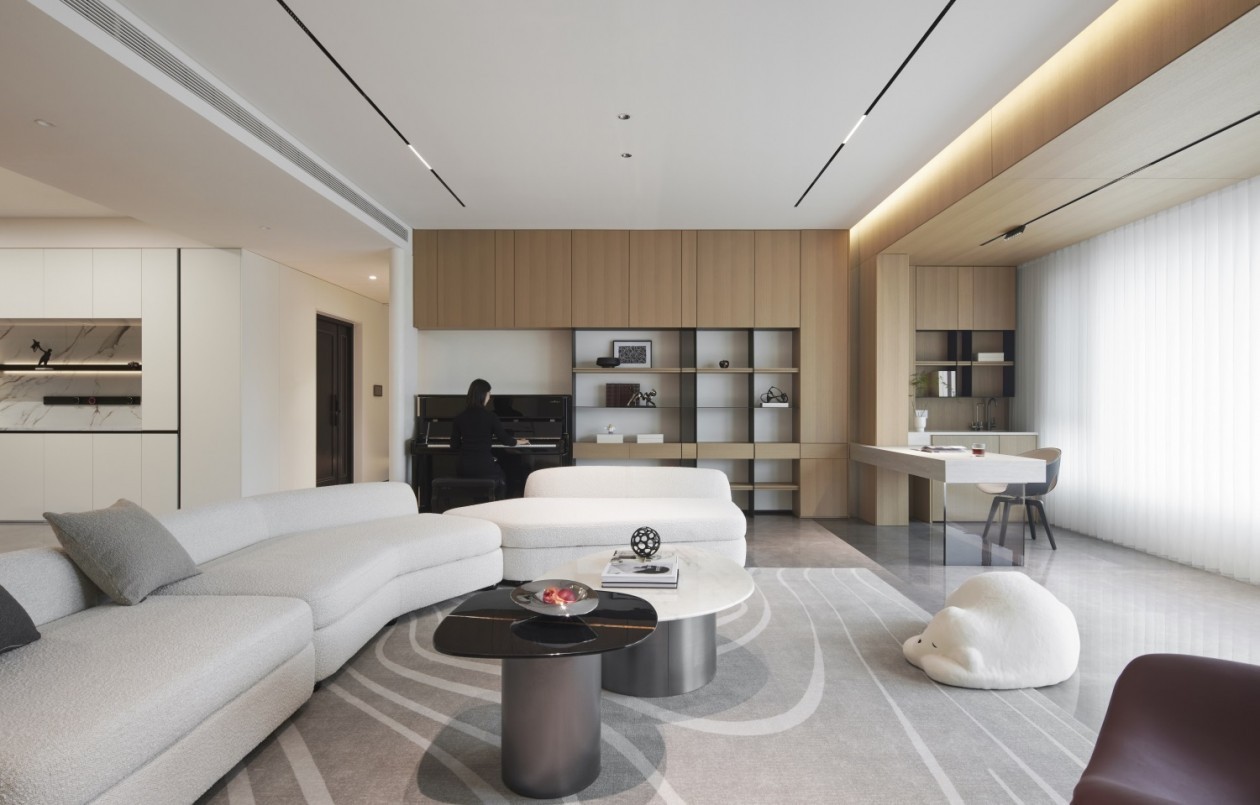 让生活融合在自然中才是住宅的本质,如云如海如山,自如自由自在 。也体现了空间“优雅”的主题 ;圆形的墙面装饰,日月同辉。