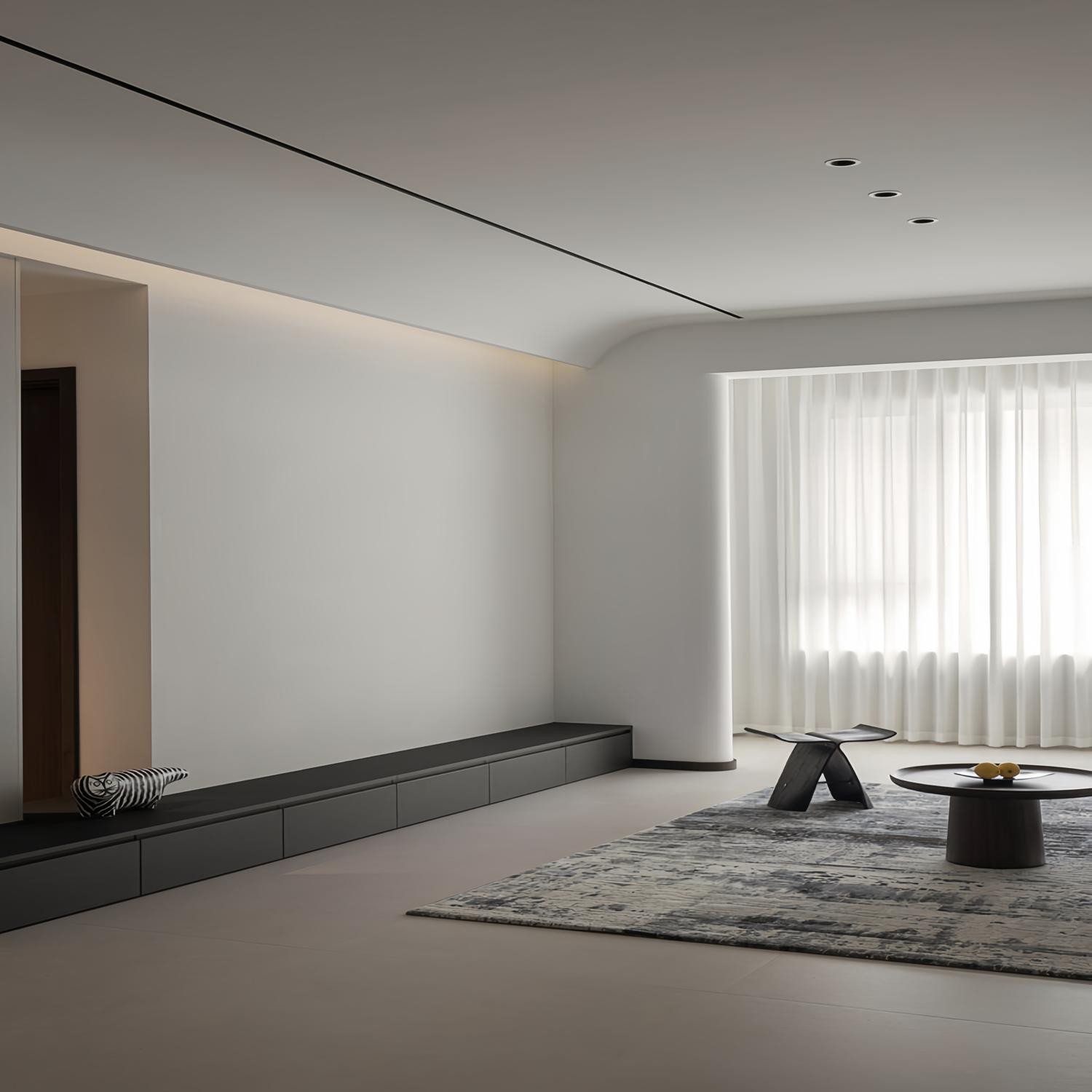 客厅两侧背景墙可以说是没有任何造型,主要的氛围感营造来自于顶面的石膏板过渡处理和灯光布局,越是极简的背景墙,对于墙面平整度要求越高,在石膏找平没法满足精细化时,可以考虑冲筋打点。