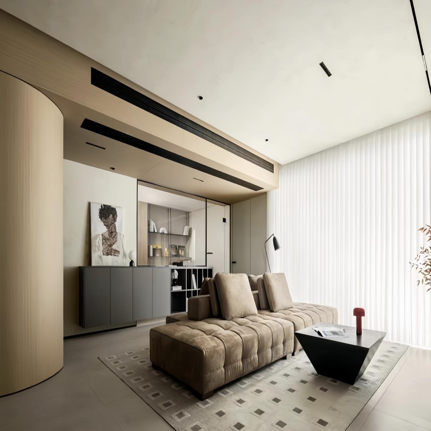 原南次卧经改造打掉,摇身一变成为开阔客厅。沙发上方横梁独具匠心地作斜坡处理,与磁吸轨道灯完美融合,既弱化了横梁的突兀感,又增添了空间的设计感。