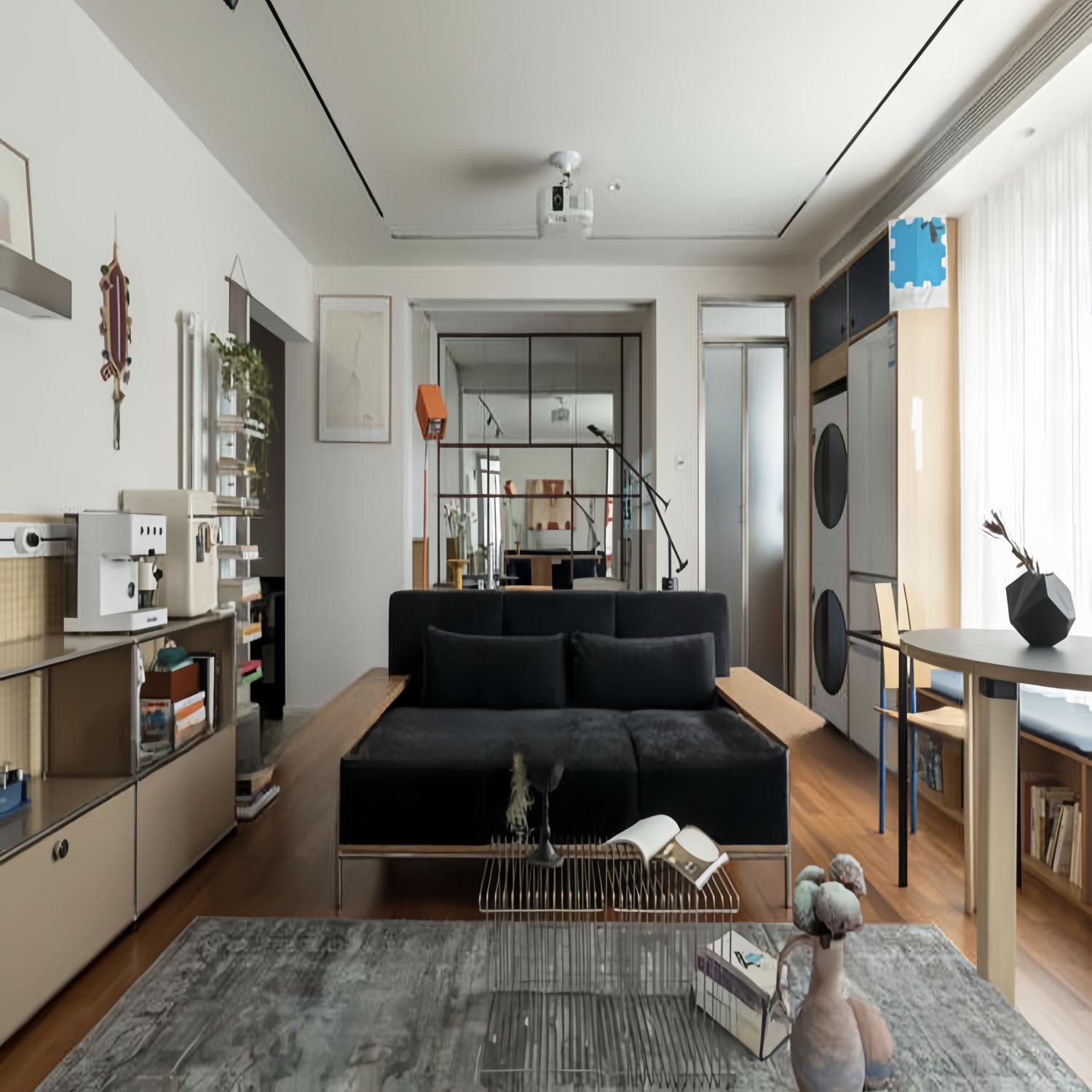 孟菲斯中古壁灯和后现代玻璃雷达灯,独特的光线设计凸显墙面和柜面的几何切割感,营造出方寸之间的秩序和艺术气息。