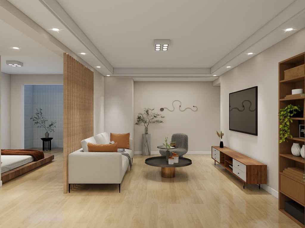 整体呈现出简约基调,又通过木质元素和软装搭配,融入自然与温馨氛围,利用木质隔断划分客厅与卧室空间,既保证区域相对独立,又维持空间通透感。以原木色地板为基调,搭配米色沙发,橙色抱枕点缀,营造出简洁又不失活力的视觉效果。绿植及艺术摆件,提升空间艺术氛围和自然气息。