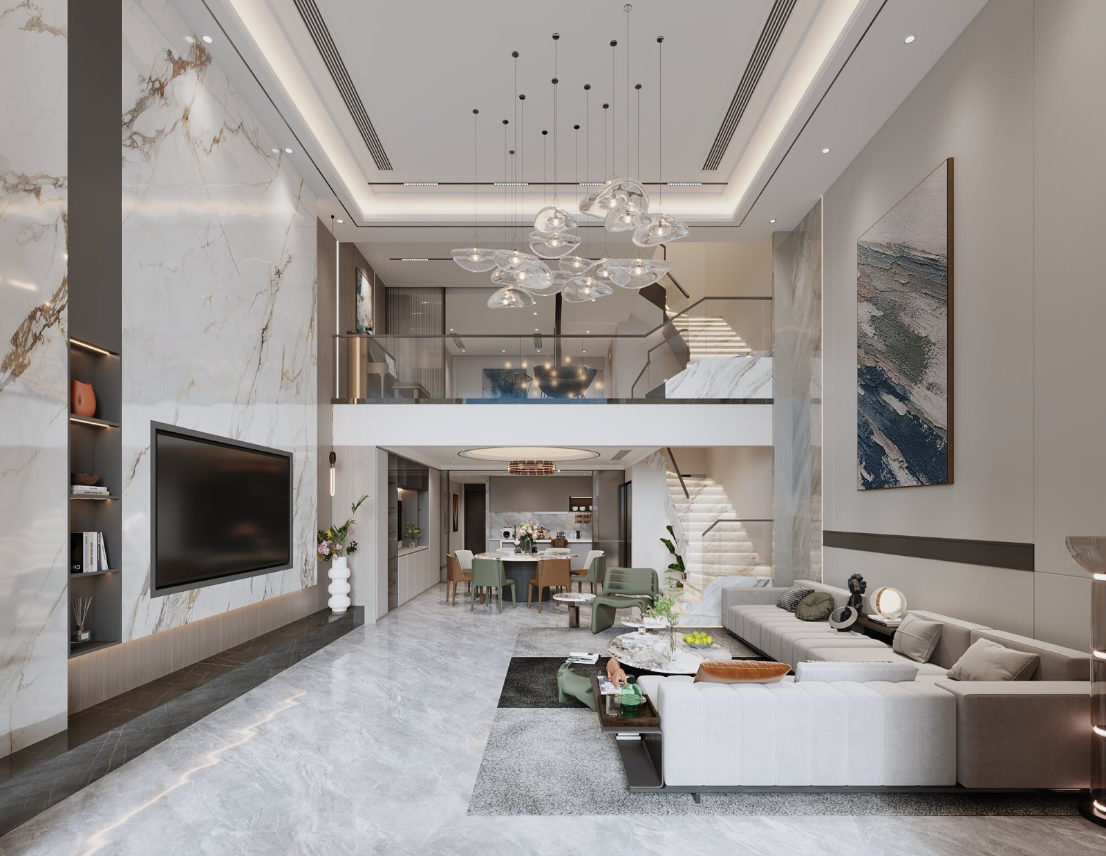 挑高客厅,阳光倾洒,设计搭配利落线条的沙发,开阔又不失格调,闲暇时窝在这里,尽享悠然时光