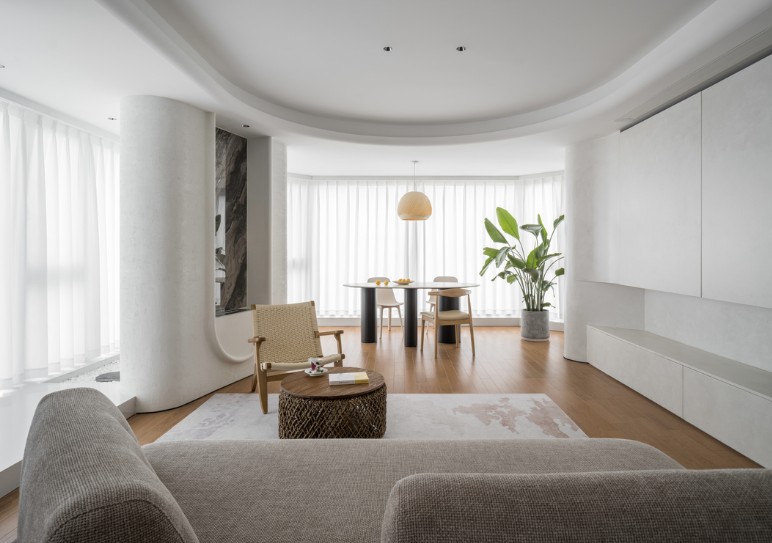 1.入户区打造L型组合收纳柜,满足出入户及客卫杂物储藏需求; 2.客厅与阳台之间打开,收获更宽敞室内活动空间; 3.阳台与主卫之间打通,将客餐厅等公区动线与主卧之间连接,让整个家的路线流动起来,更加灵活便捷; 4.将浴缸单独搬进主卧,契合嵌入弧形落地窗,给予屋主泡澡放松时更舒适的
