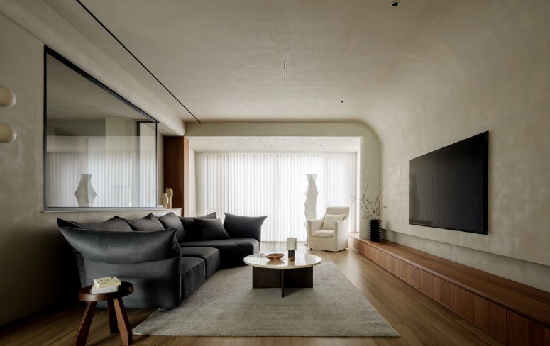 由于不可避免的梁,为了不让空间当中太多直线破坏舒缓优雅的氛围,所以在梁的基础上将它包裹出圆弧支柱,致敬传统中式立柱的同时让这个空间更适合屋主。