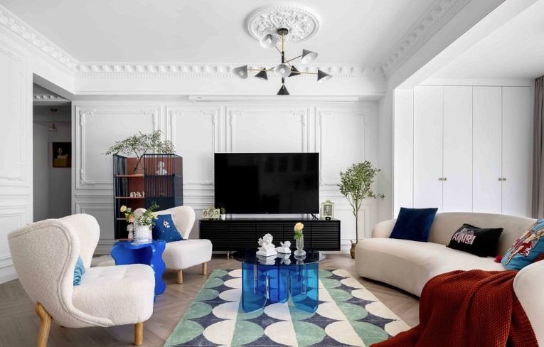 客厅石膏阴角线丰富了空间的层次,各种摆件艺术品起到点睛作用。同时法式壁炉存托出家的温暖,海蓝色的边几增添***空间感,展现独特空间美学。