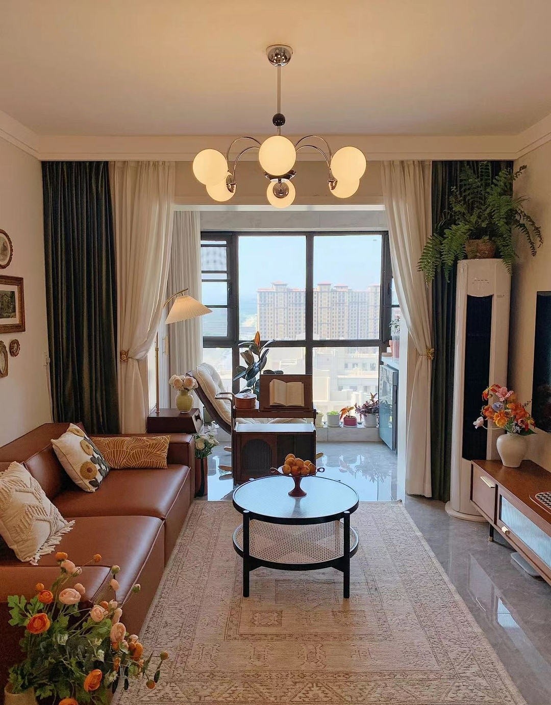 设计风格偏向于现代简约与温馨风结合,以棕色皮革沙发搭配米白色墙面,色彩温暖和谐。绿植与花卉点缀增添生机,大窗户引入充足自然光。整体布局适合休闲放松,一家人围坐聊天或独自静享阳光,营造出惬意的居家氛围。